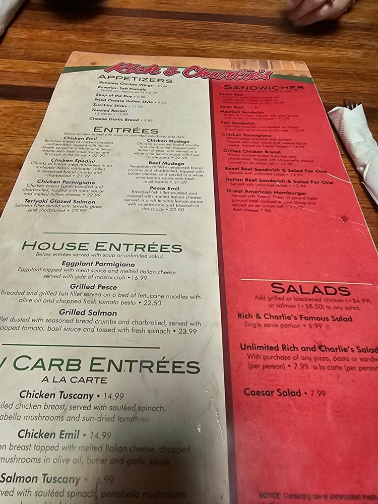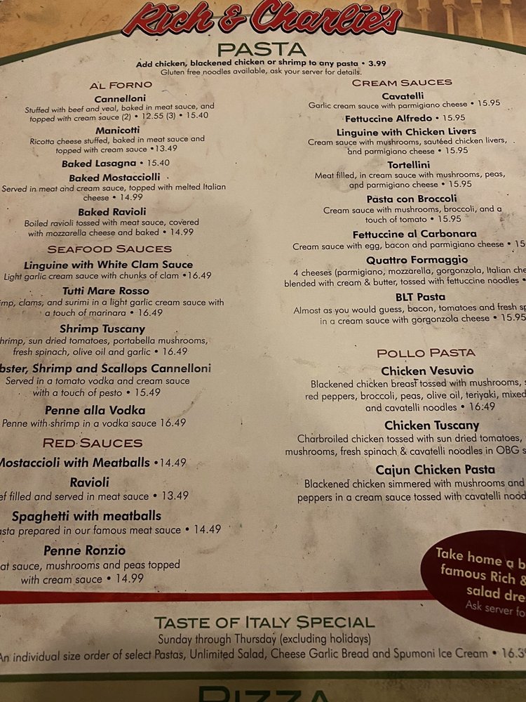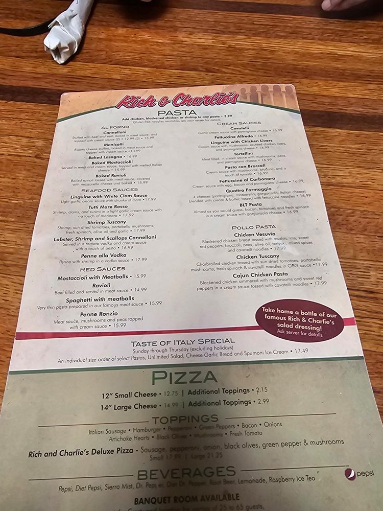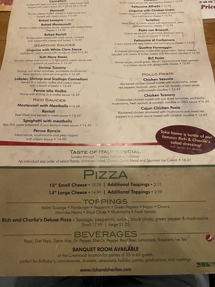At Rich & Charlie’s, you’ll not only savor exceptional pizzas but also appreciate the thoughtful touches like free Wi-Fi, waiter service, and ample parking. Bring the whole family, and enjoy a memorable dining experience!